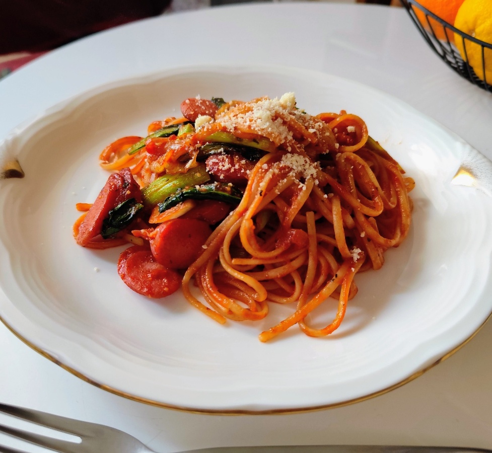 今回はばーちゃん特性の愛情ナポリタン。麺はリングイネを使用させて頂きます。
